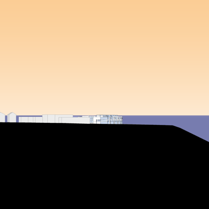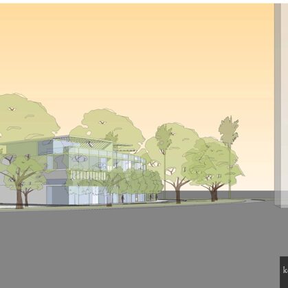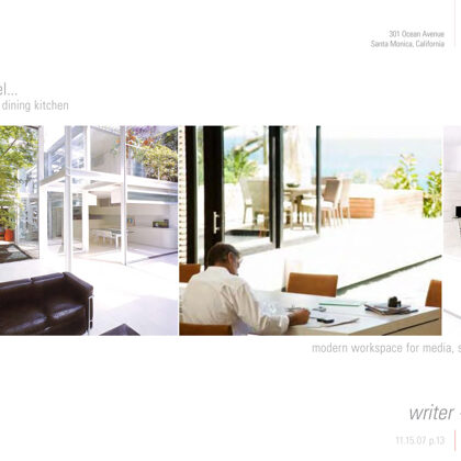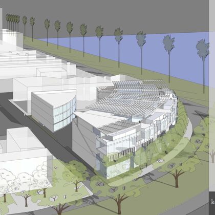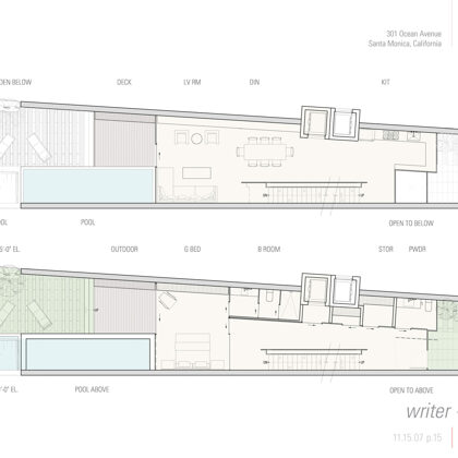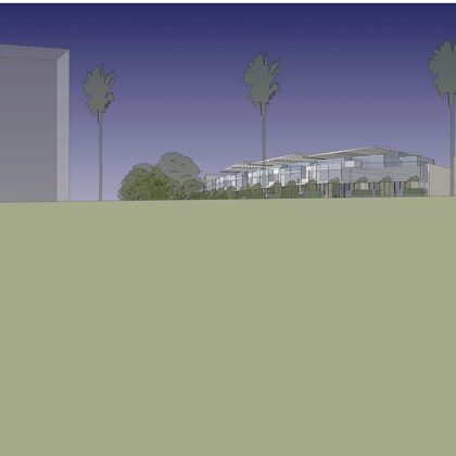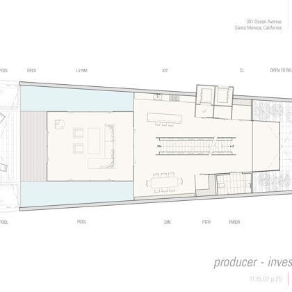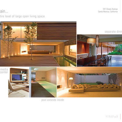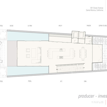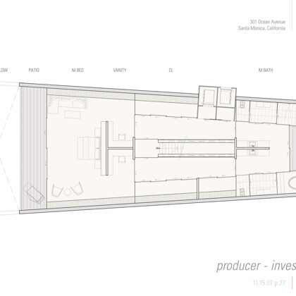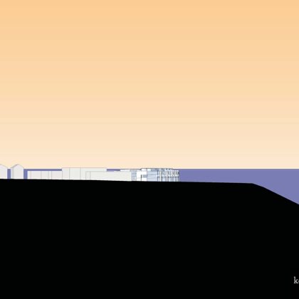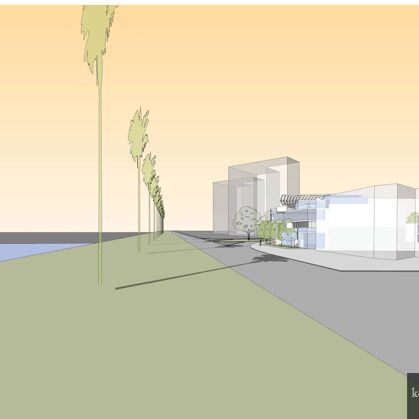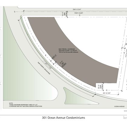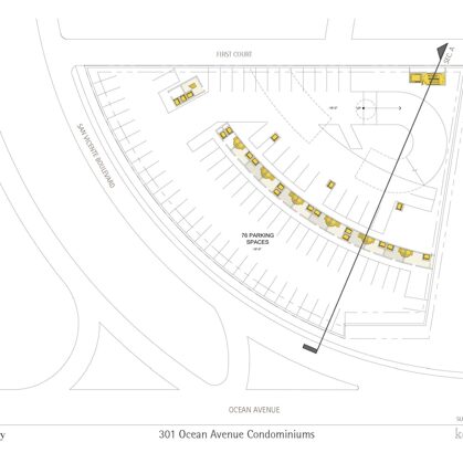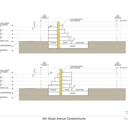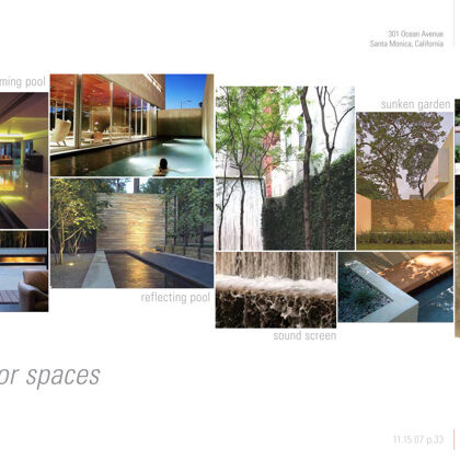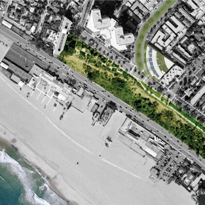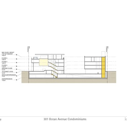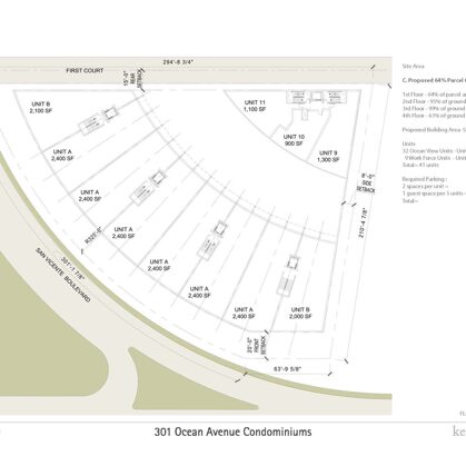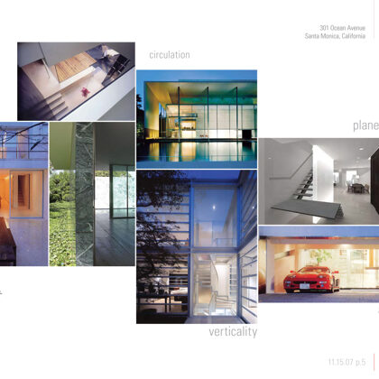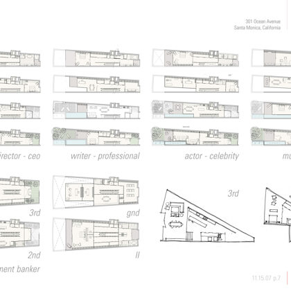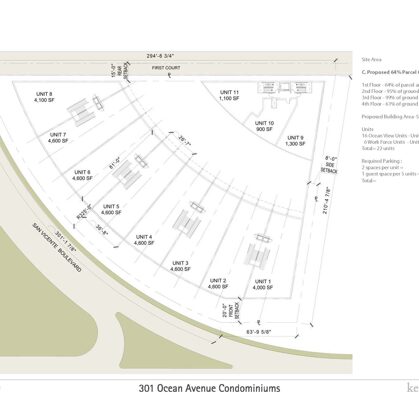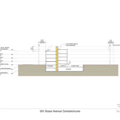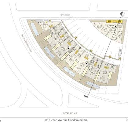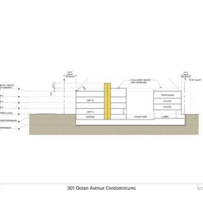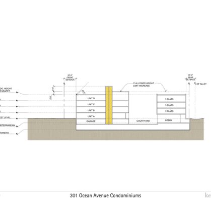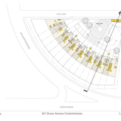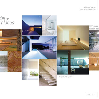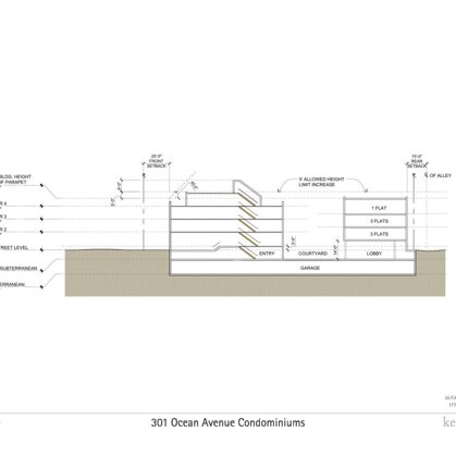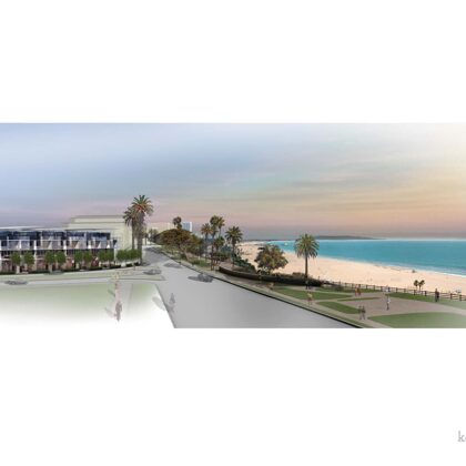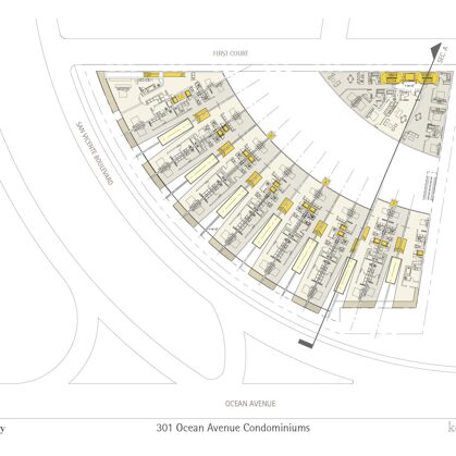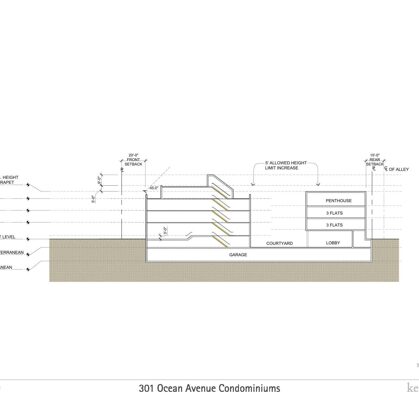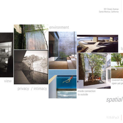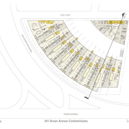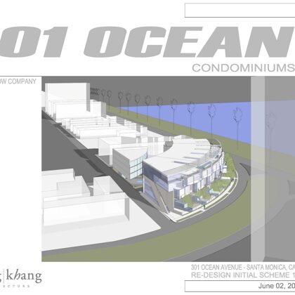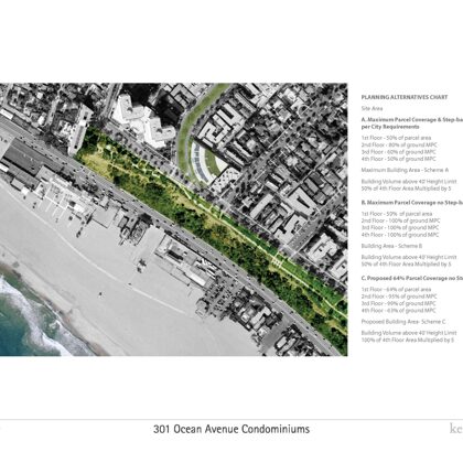 At the convergence of Ocean Avenue and San Vicente in Santa Monica, where the city gracefully meets the ocean and the vast expanse of the sky, a remarkable design is sought-after. This design not only aims to fulfill the requirements for luxurious condominiums with breathtaking ocean views but also endeavors to contribute to the architectural tapestry of the city, drawing inspiration from the site's exceptional character. Much like a bird soaring amidst the wind or a fan elegantly fanning against the expansive sky, this building emanates from the surrounding block-by-block housing along San Vicente, reaching towards the limitless horizon beyond the Pacific.