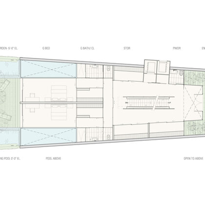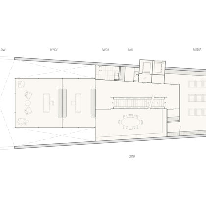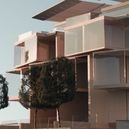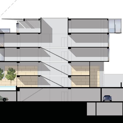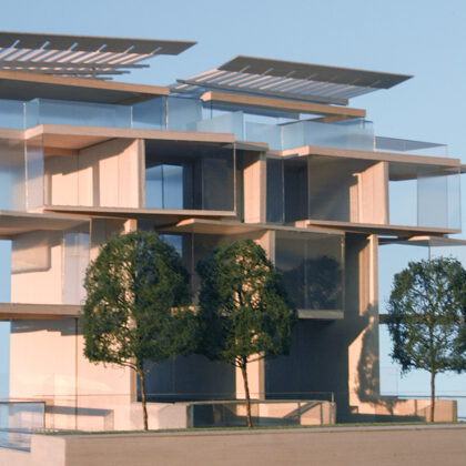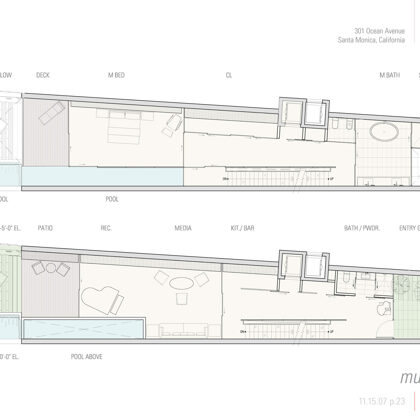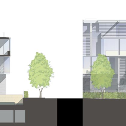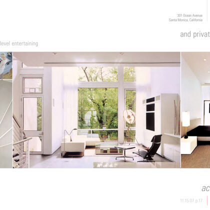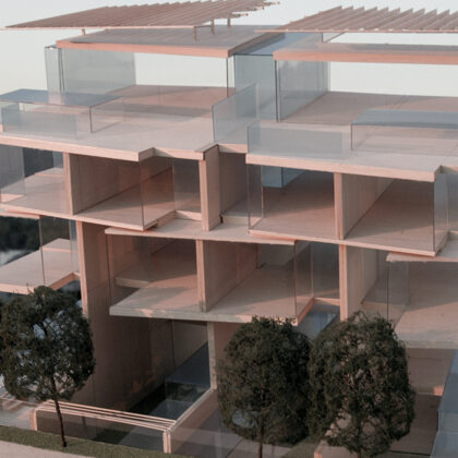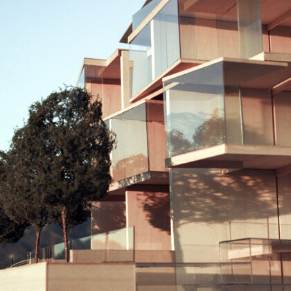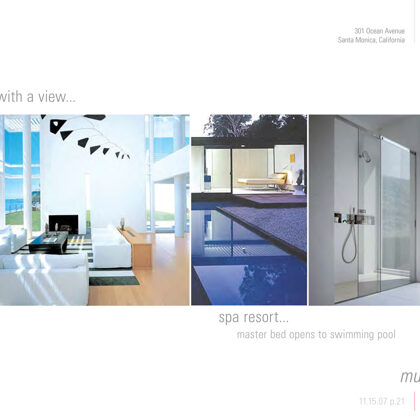 Architecturally, the expression of the building emphasizes terra cotta screens for the bedroom windows, while generously employing expansive glass surfaces for the living areas. The pools located at the penthouse level feature acrylic sides, intermittently revealing the mesmerizing glow of the water to passersby on the street. Each penthouse roof boasts a soaring screen, further enhancing the fan-like character of the building as it reaches towards the sky.