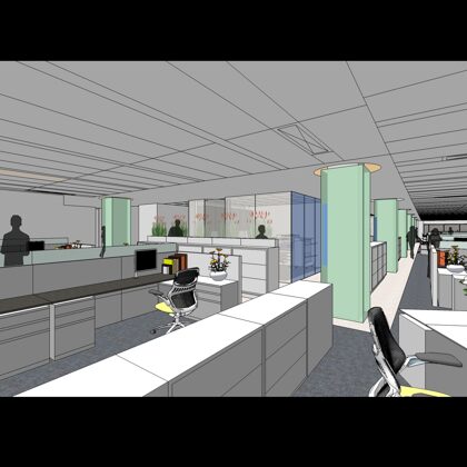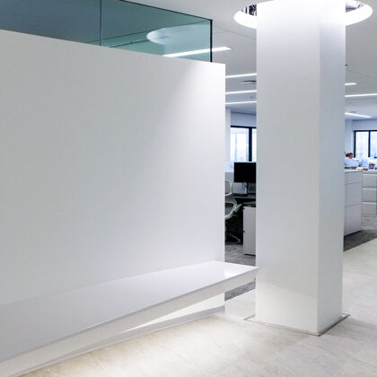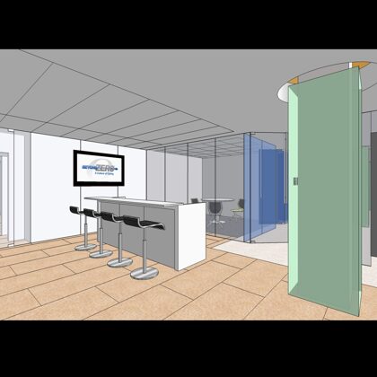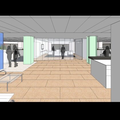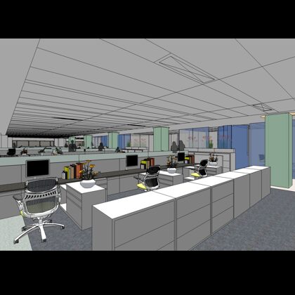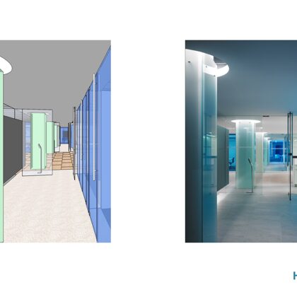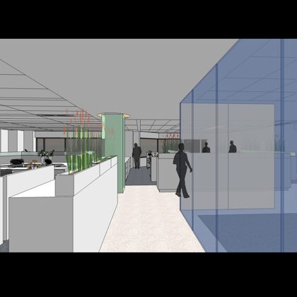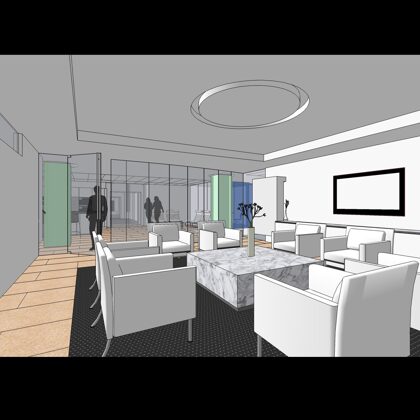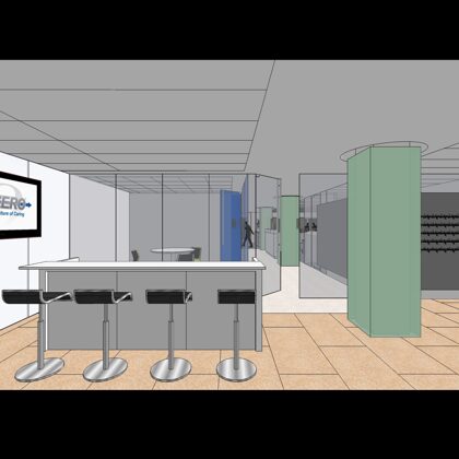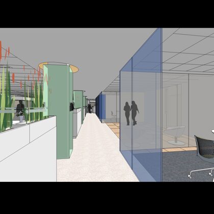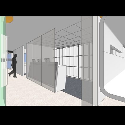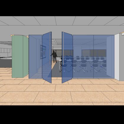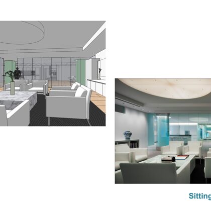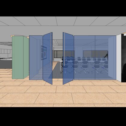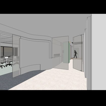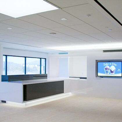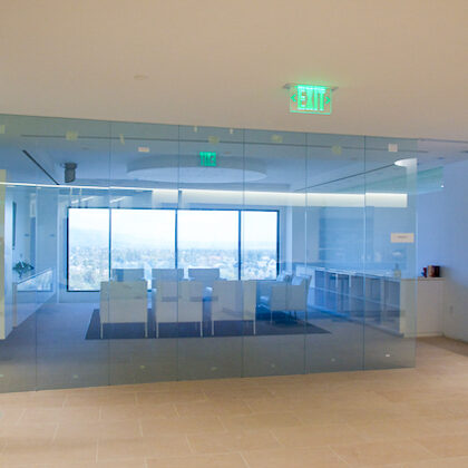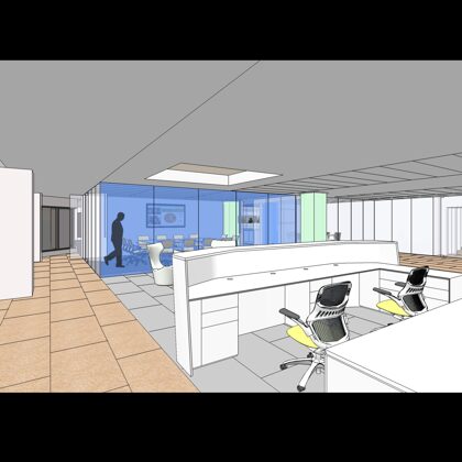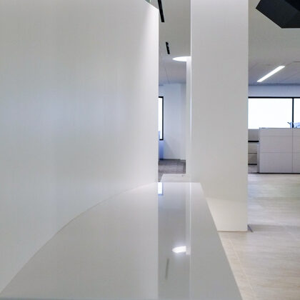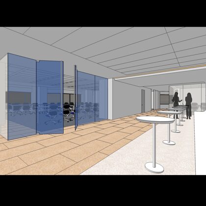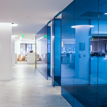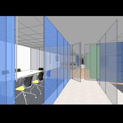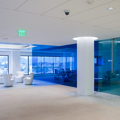 The design was a new and modern departure for the client. The overall effect was achieved through the creative and considered use of modest rather than lavish materials and a simple color palette. Sculpted sheetrock lends variety and interest to multifunction rooms on each floor. Blue glass was used as a primary design feature and is a consistent material used in client's other offices.