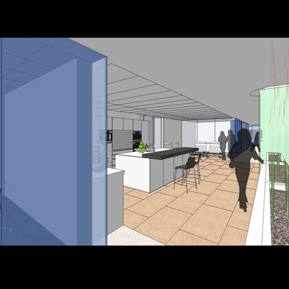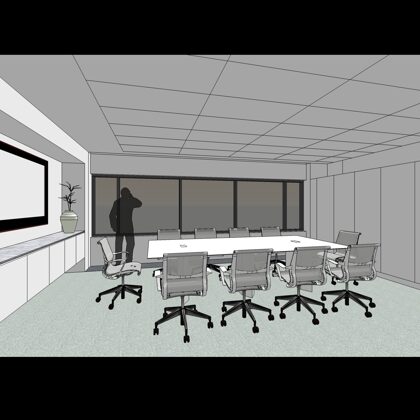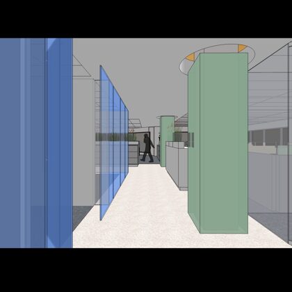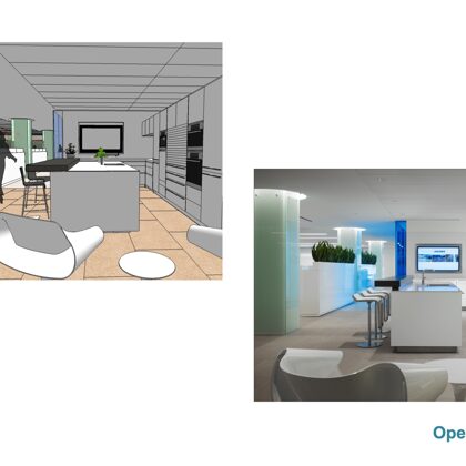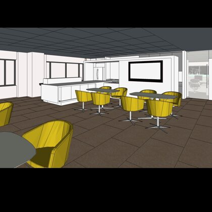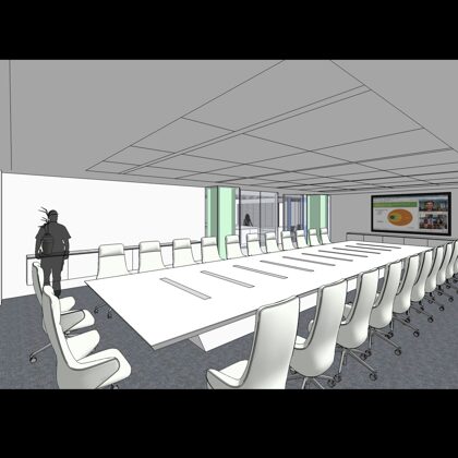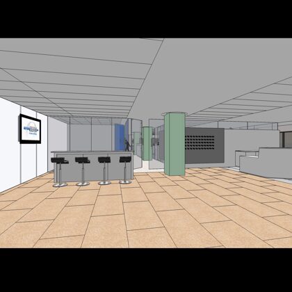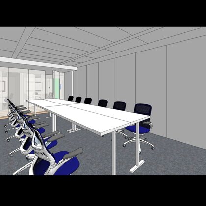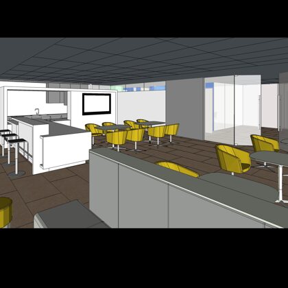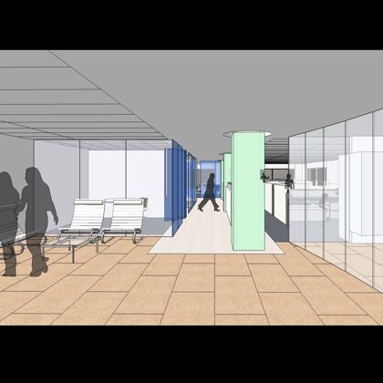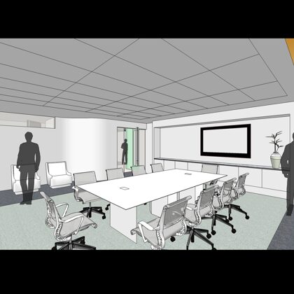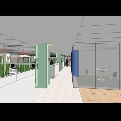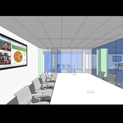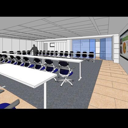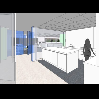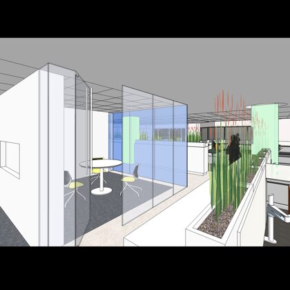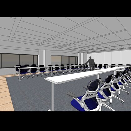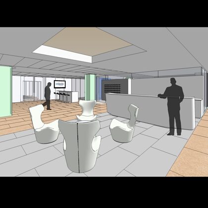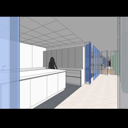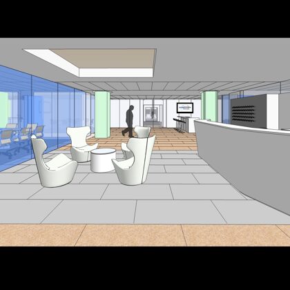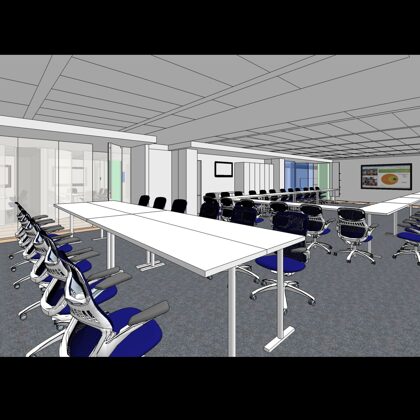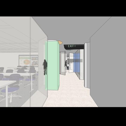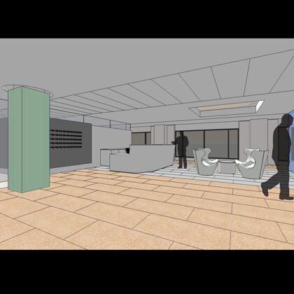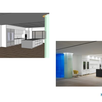 The design was a new and modern departure for the client. The overall effect was achieved through the creative and considered use of modest rather than lavish materials and a simple color palette. Sculpted sheetrock lends variety and interest to multifunction rooms on each floor. Blue glass was used as a primary design feature and is a consistent material used in client's other offices.