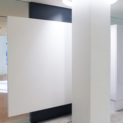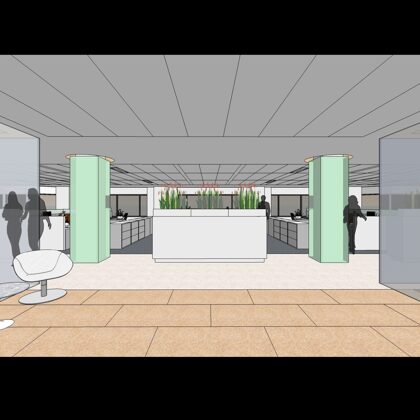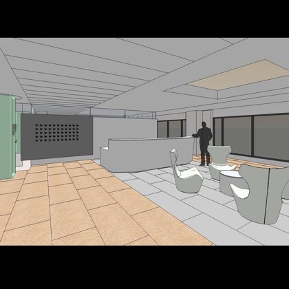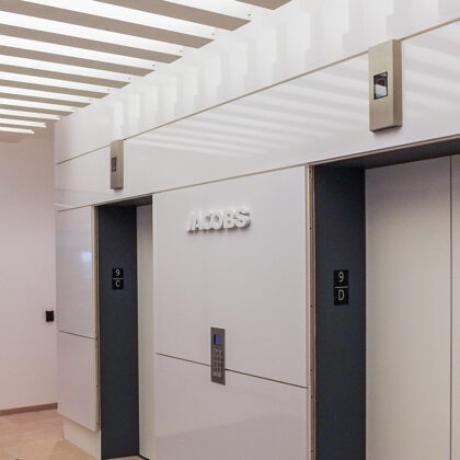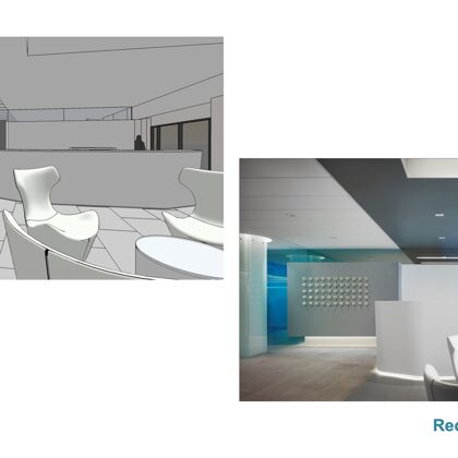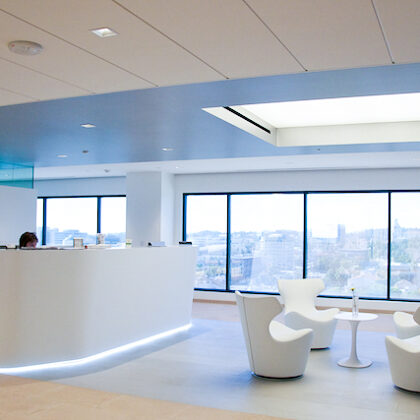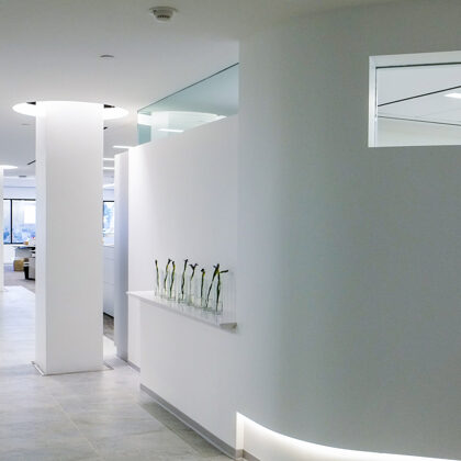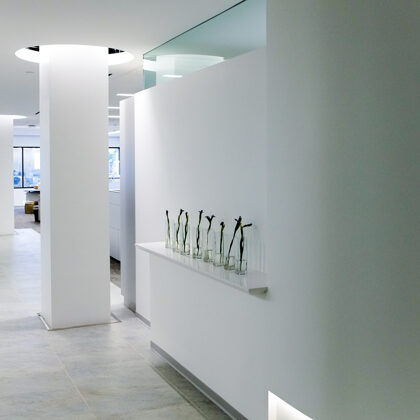 The reception area is centered on a primary view of the surrounding city and the magnificent city hall. From the test tubes set in a grid on the wall that accommodate fresh flowers to the “skylight” lighting over the seating group, the understated but refined space orients and greets visitors with a clear message of professionalism and a focus on the future.