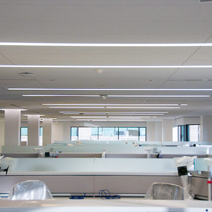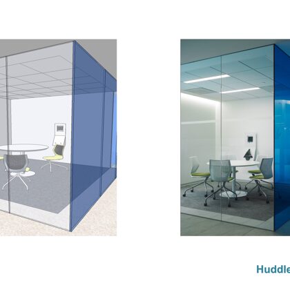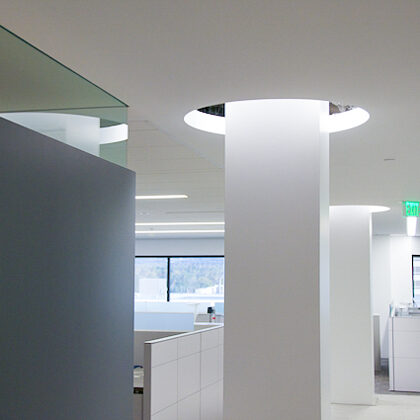 A challenging feature of the space was a ring of structural columns located in the middle of the lease space. To address this, the design team arranged workstations in the outer ring formed by the columns and located huddle, conference and quiet rooms in the inner ring around the building’s core. The mix of spaces supports different types of work that happen throughout the day. Room partitions of full-height glass were used to maximize visibility and extend day-lighting from the perimeter deep into the floor plates. The design team also turned the structural columns into a design and safety feature. Each column was encased in a floor-to-ceiling frosted glass box, and each box was lit from above to create glowing pillars that define the path to emergency exits, much like an exit path on an airplane.
