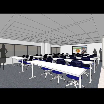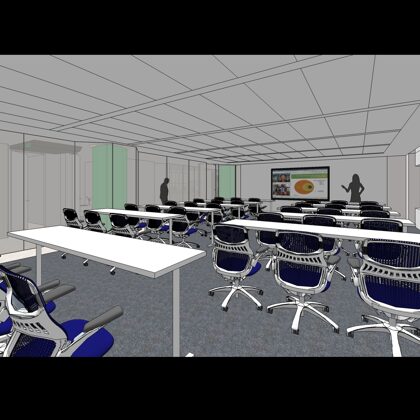 Occupying half a floor, the training center brings employees and clients from around the world into headquarters throughout the year for specialized training and opportunities to learn from and engage with colleagues across business units. Unique features include custom designed lecterns and 30-foot-long suspended benches for ample seating in the pre-function area.